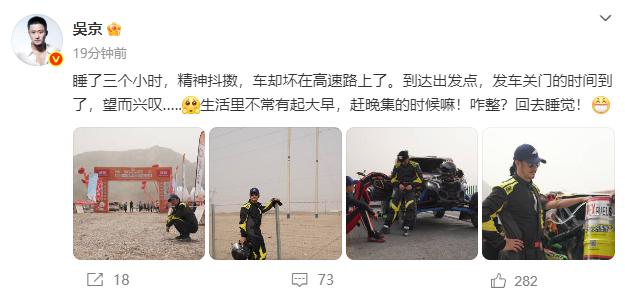 吴京写道:“睡了三个小时,我精力充沛,但我的车在高速公路上坏了。到了出发点,该关门了,我叹了口气。 …… 人生不常有早起,赶晚集的时候嘛!怎么整理?回去睡觉!”