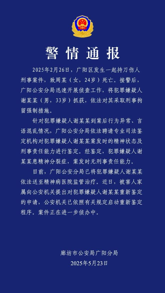5月23日19时许,河北省廊坊市公安局广阳分局官微发布警情通报称,2025年2月26日,广阳区发生一起持刀伤人刑事案件,导致周某(女,24岁)死亡。广阳市公安局接到报警后,迅速开展调查工作,逮捕犯罪嫌疑人谢某某(男,33岁),并依法采取强制刑事拘留措施。