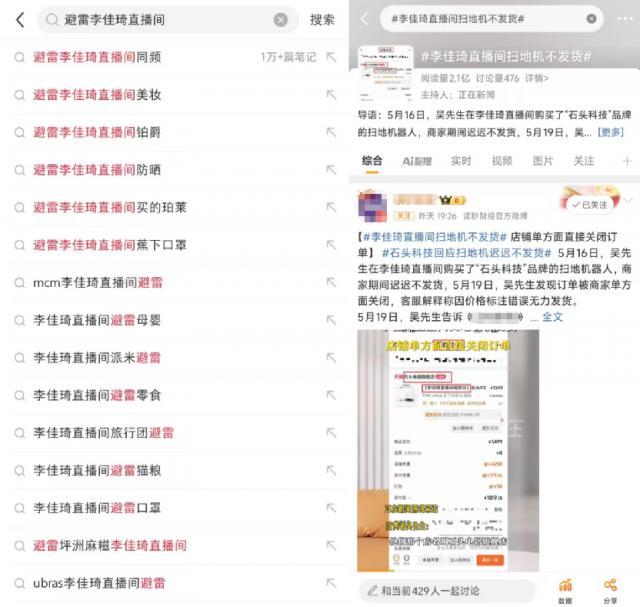“防雷李佳琦直播间同频”在小红书上 1 万 一篇笔记,微博话题 # 现场扫地机李佳琦不发货。 # 有超 2 上亿的阅读,说明有关事件的知名度很高。