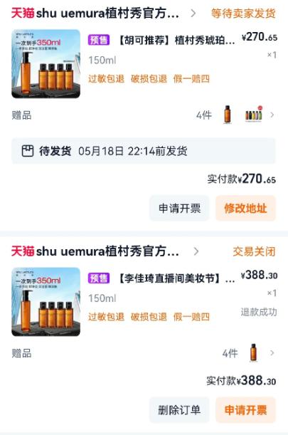 坂坂坂在李佳琦的直播间抢了四年,发现现在最低价格不保证了。“同样卸妆水的主要区别在于定金红包,我在胡可的直播间成功减少了。 270 元,李佳琦的直播间居然要去了 388 元,严严实实贵,接近近 100 多。"