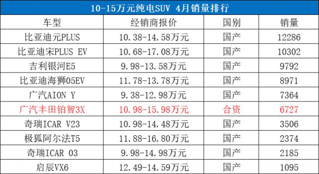 目前示界 06 只有一款车型,官方指导价是 12.58 万元。所以这篇文章截取了今年。 4 月份,10-15 纯电在一万元范围内 SUV 车型销售数据的市场。 10 名称中,基本上都是国产车型覆盖,只有 3 广汽丰田铂智月上市 3X,在 4 在月份获得完整的销售数据后,成为榜单上唯一的合资车型。