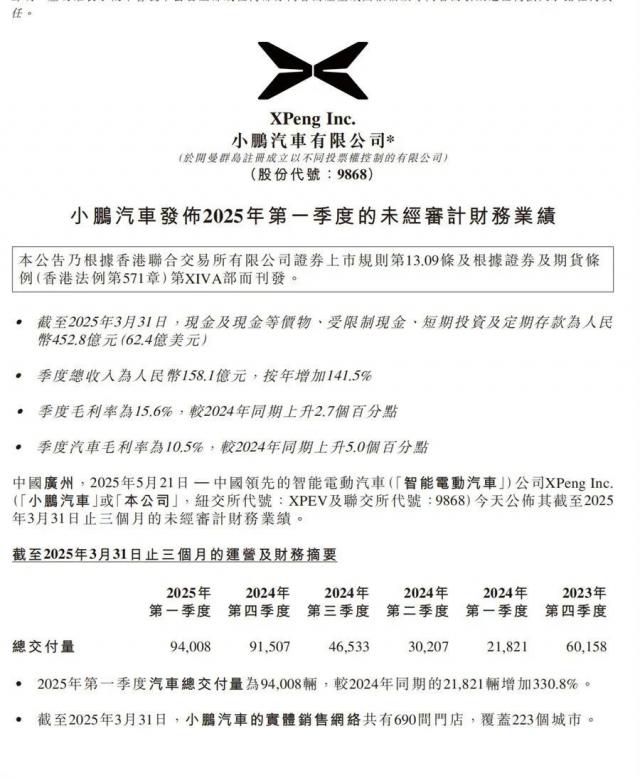 财务报告显示,小鹏第一季度总收入 158.1 亿元,同比大幅上涨 141.5%,15.6% 毛利率也创历史新高;其中,汽车销售收入为 143.71 亿元,同比增长 汽车毛利率达到159.2% 10.5%,较 2024 年同期增长 5 %。