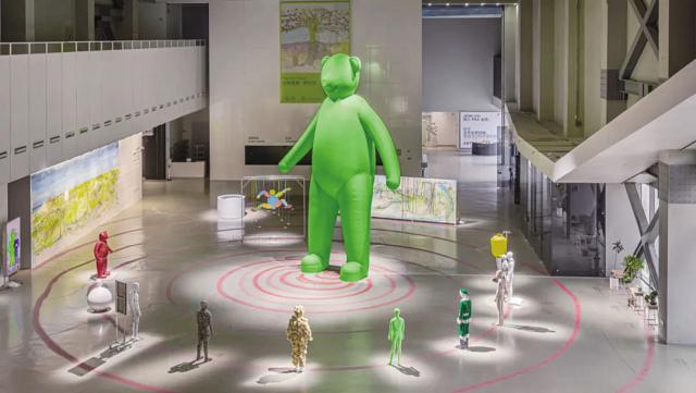 一旦进入上海当代艺术博物馆,“人”的存在就迎面而来——许多作品都蕴含着隐喻。巨大的绿色充气“伊贝尔泰迪”(Ted Hyber,受“泰迪熊”双关语的启发), 自画像作为艺术家,傲然屹立在花园中央。艺术家巧妙地将地面的缝隙转化为绘画的脉络,从巨像延伸到周围。它站在这个由过去的电站改造而成的艺术博物馆中央,涌动着知识、思想和想法,滋润着整个房间。" 伊贝尔英雄“安身于展览再现的林间空地,每一个人都能在自己的姿态中产生共鸣。