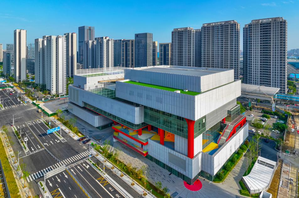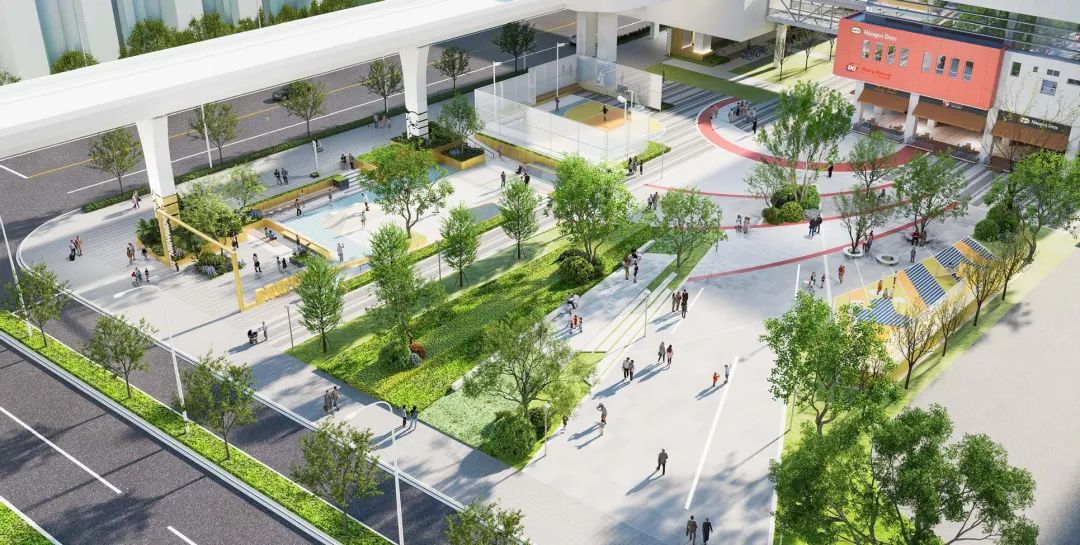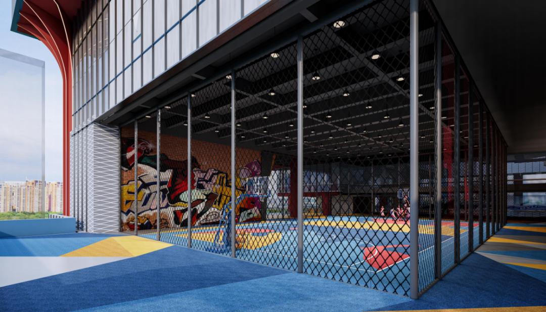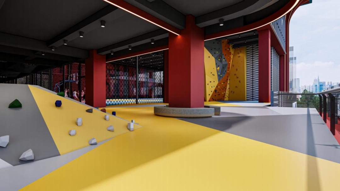 同时,文化体育中心高效统筹利用周边室外场所,规划配置室外趣味互动设备、亲子游戏区、休闲运动区等空间作为中心功能的延伸,通过融入科技、艺术、生态元素,满足大家对时尚、创新、互动的户外空间需求。
