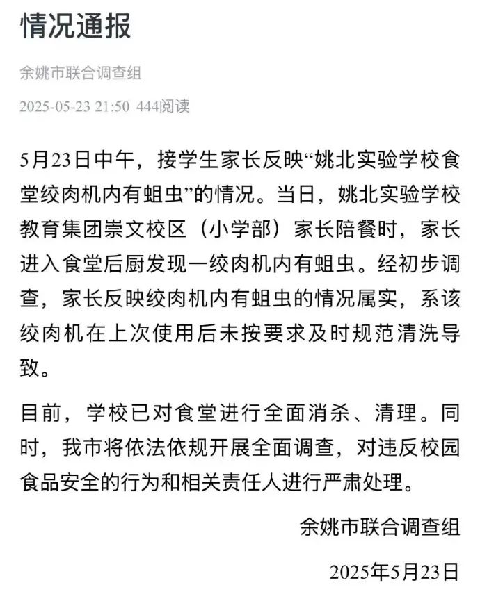 5月23日中午,接学生家长反映“姚北实验学校食堂碎肉机里有蛆”。当天,姚北实验学校教育集团崇文校区(小学)父母陪同吃饭时,父母进入食堂厨房,发现碎肉机里有蛆。经初步调查,家长反映碎肉机里有蛆是真的,是上次使用后碎肉机没有按要求及时规范清洗造成的。