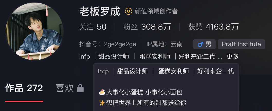 三年前,罗成在TikTok上发布了第一个短视频。三年后,TikTok账号“老板罗成”的粉丝已经超过300万。在他的主页上,每个人都有自己的Infp。 | 甜品设计师 | 蛋糕安利师 | 好利来企二代四个关键字,好利来企二代这一身份,被他放在了最后。