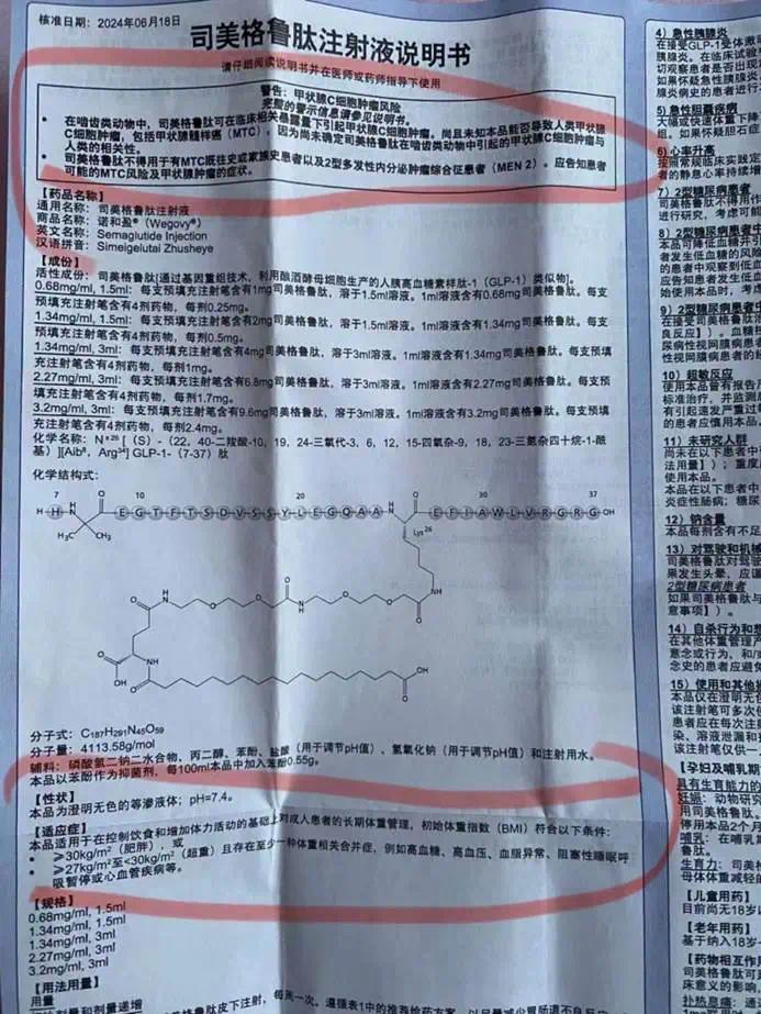 更重要的是,减肥针并不适合所有人。以司美格鲁肽为例,说明书中明确提到,不得用于甲状腺髓样癌既往史或家族史患者和2型窦汇区内分泌肿瘤综合征患者。而且这种药物有严格的适用标准:只适用于有胰岛素抵抗、高血糖等代谢问题的BMI>30或BMI>27患者。
