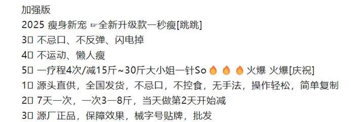 以 “大小姐减肥针” 举例来说,社交平台对它的宣传非常有吸引力:这个品牌被称为韩国品牌, “顽固的天敌”。而且使用过程中不会头晕呕吐,也不需要刻意避免嘴巴和运动就可以减肥。据报道,一个疗程可以减肥。 15斤左右。