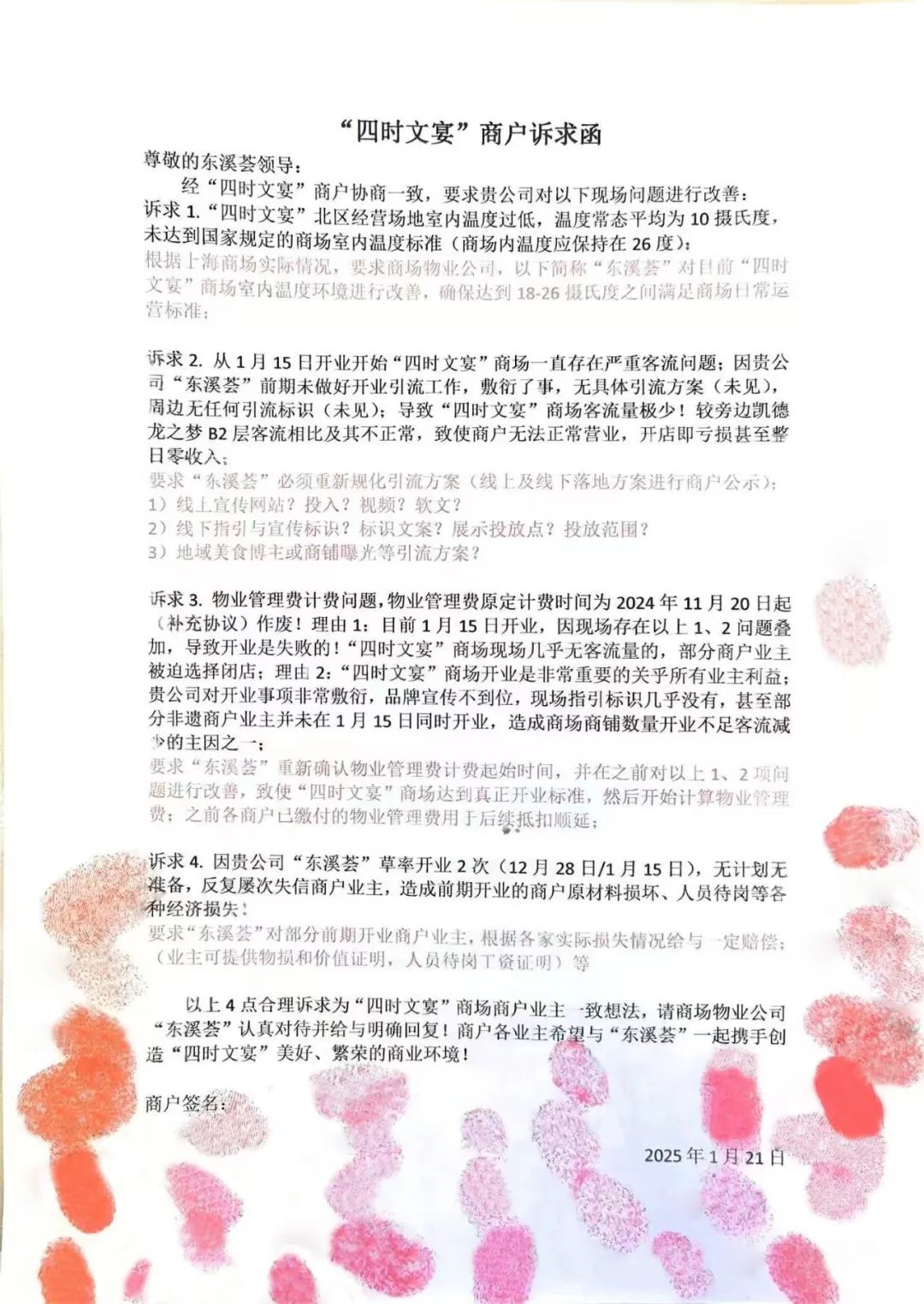 2025年1月21日,30名商家联合向运营商提交需求信,指出场所存在长期低温、人流不足、异味偏重、物业服务不足等问题,要求改善供暖,加强引流,并对经营损失提出补偿请求。