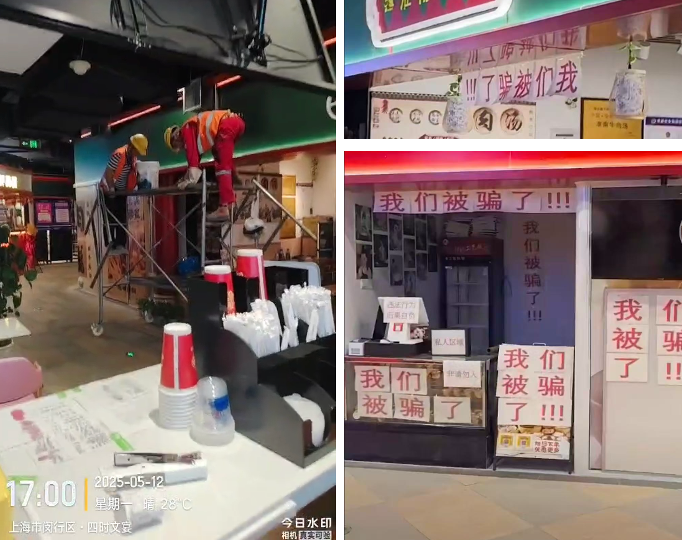 但就在一周前,这个空间仍然可以自由进出。根据5月12日的现场视频,很多商家在门前张贴了写有“我们被骗了”的A4纸,一些供应商正在拆除排烟设施。