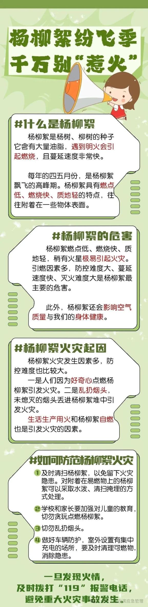 柳絮一旦起火,扩散速度极快,千万不要通过点火来清理柳絮,引燃柳絮引起火灾将被追究相应的法律责任。