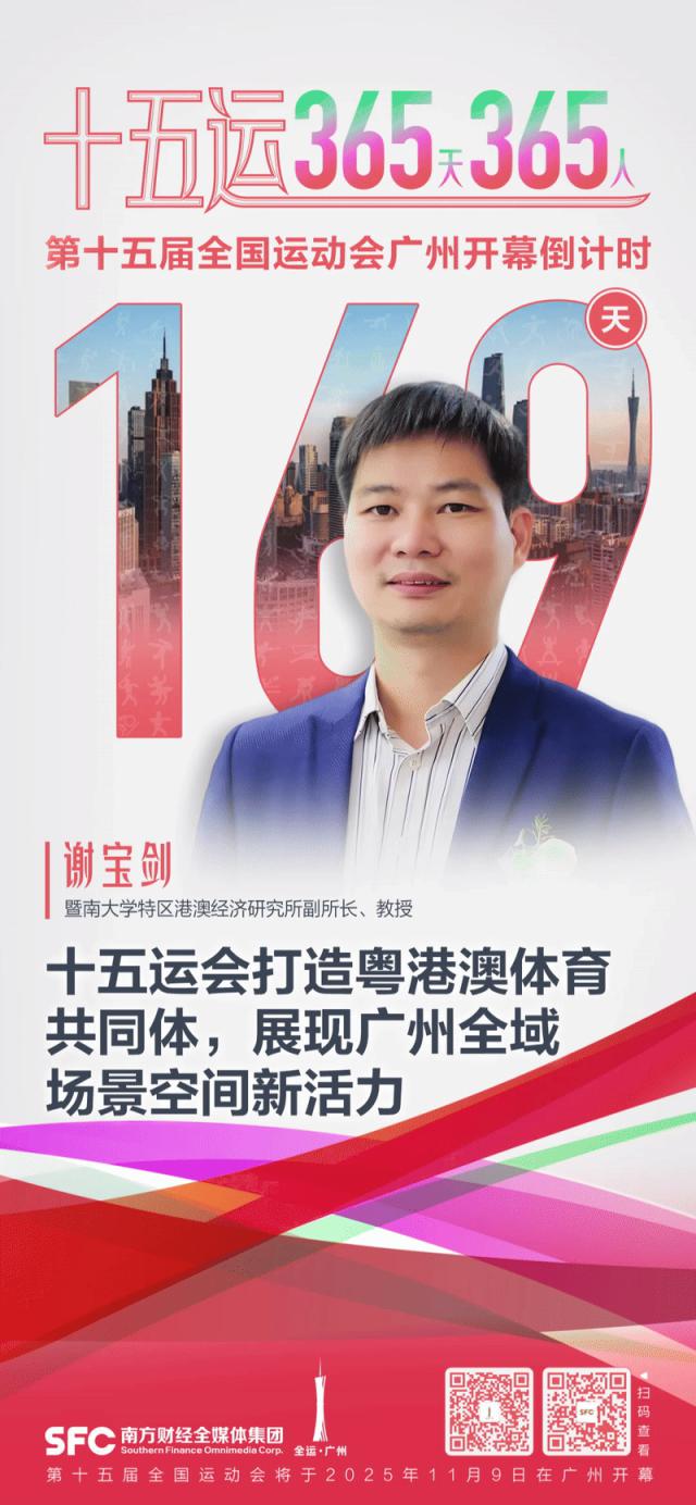 最近,在“活力湾区”・新彩广州・暨南大学特区港澳经济研究所副所长谢宝剑教授在“全运”研讨会暨特聘专家顾问聘任仪式上被聘为第十五届全运会特聘专家。针对今年 11 第十五届全国运动会将于月在粤港澳三地举行,谢宝剑发表了专业见解。