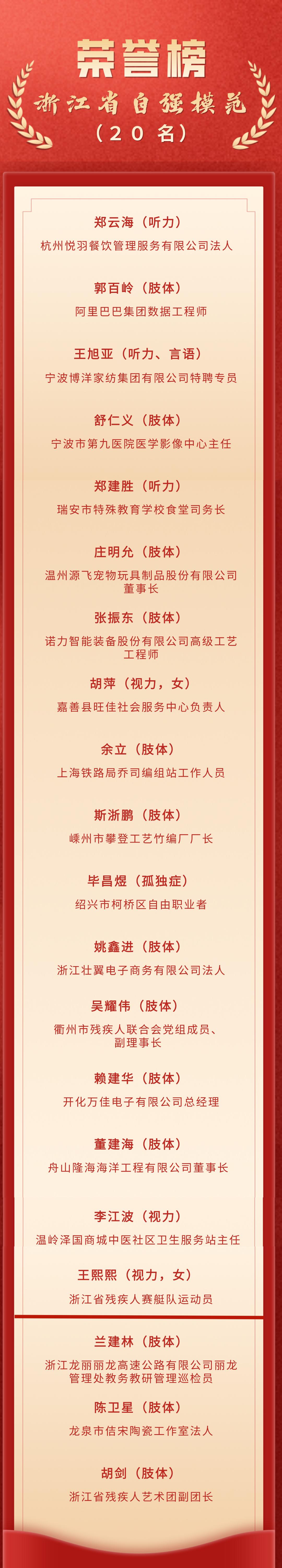 5月20日,省政府公布了浙江省新一批自强模范和先进集体和先进个人表彰名单,帮助残疾人。其中,椒江残疾人赛艇运动员王熙熙被授予“浙江省自强模范”称号。