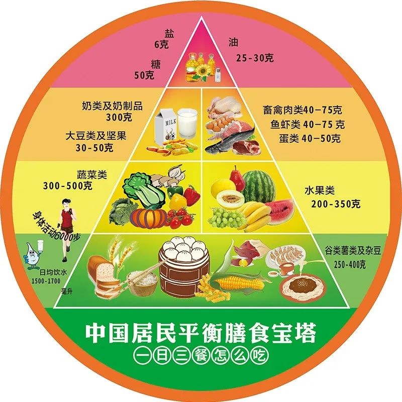 膳食宝塔模型:以谷物为主,结合足够的水果和蔬菜,高质量的蛋白质(鱼、豆、蛋、奶),控制油、盐、糖。