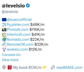 看看发起者 levelsio 简历,发现这个兄弟挺传奇的。工商管理出身,但首页挂着几个月利润夸张的互联网项目。介绍里写着我一年。 12 第二次创业的绝世简历,看起来是一个成功的人,已经实现了财富自由。