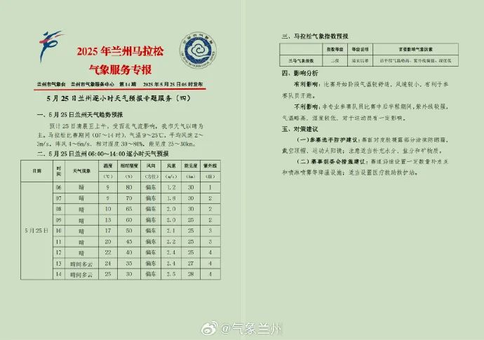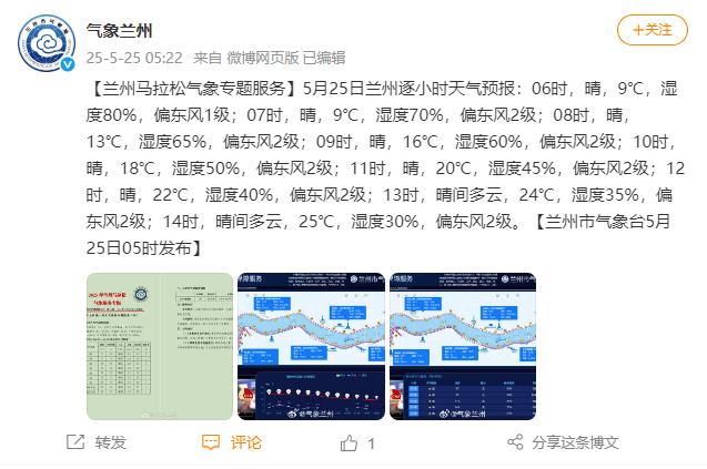 【兰州马拉松气候专题服务】5月25日兰州每小时天气预报: