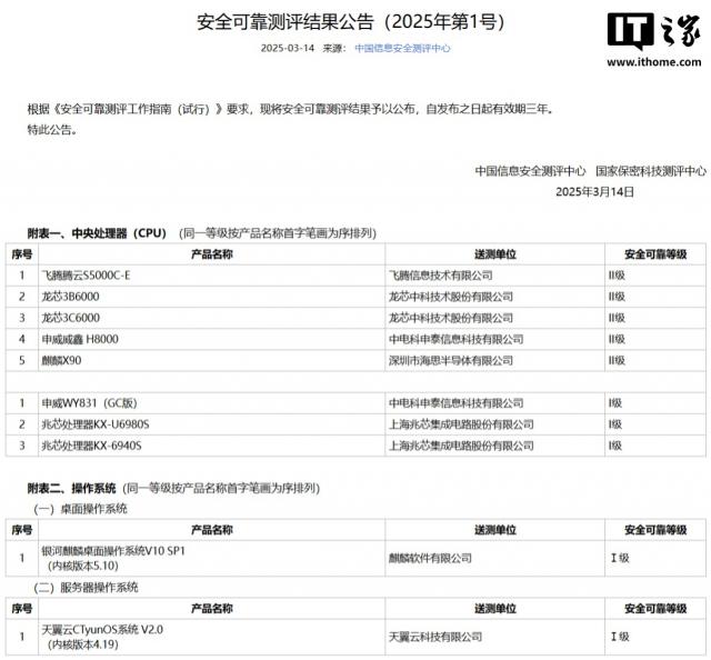 据 IT 据世家报道,今年中国信息安全评估中心 3 月 14 2025年安全可靠评估结果公告(2025) 年第 1 号码),其中海思麒麟 X90 Cpu安全可靠等级评估结果如下 II 级。