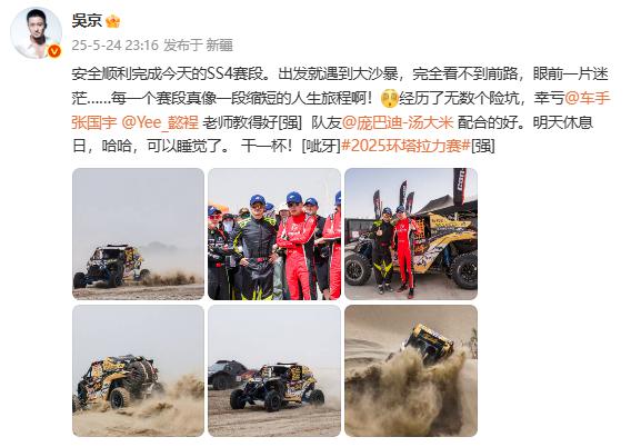 5 月 24 晚上,@吴京 发帖:今天安全顺利完成。 SS4 赛段。开始的时候遇到了大沙暴,完全看不到前面的路,眼前一片迷茫...每个赛段真的像是一段缩短的人生旅程!