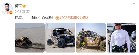 在此之前,吴京晒出了自己的参与。 2025 环塔拉力赛的照片,配文:环塔,一种新的生活体验。照片中,吴京站在环塔拉力赛的沙漠跑道上,留着胡子,看起来比以前瘦了一点。
