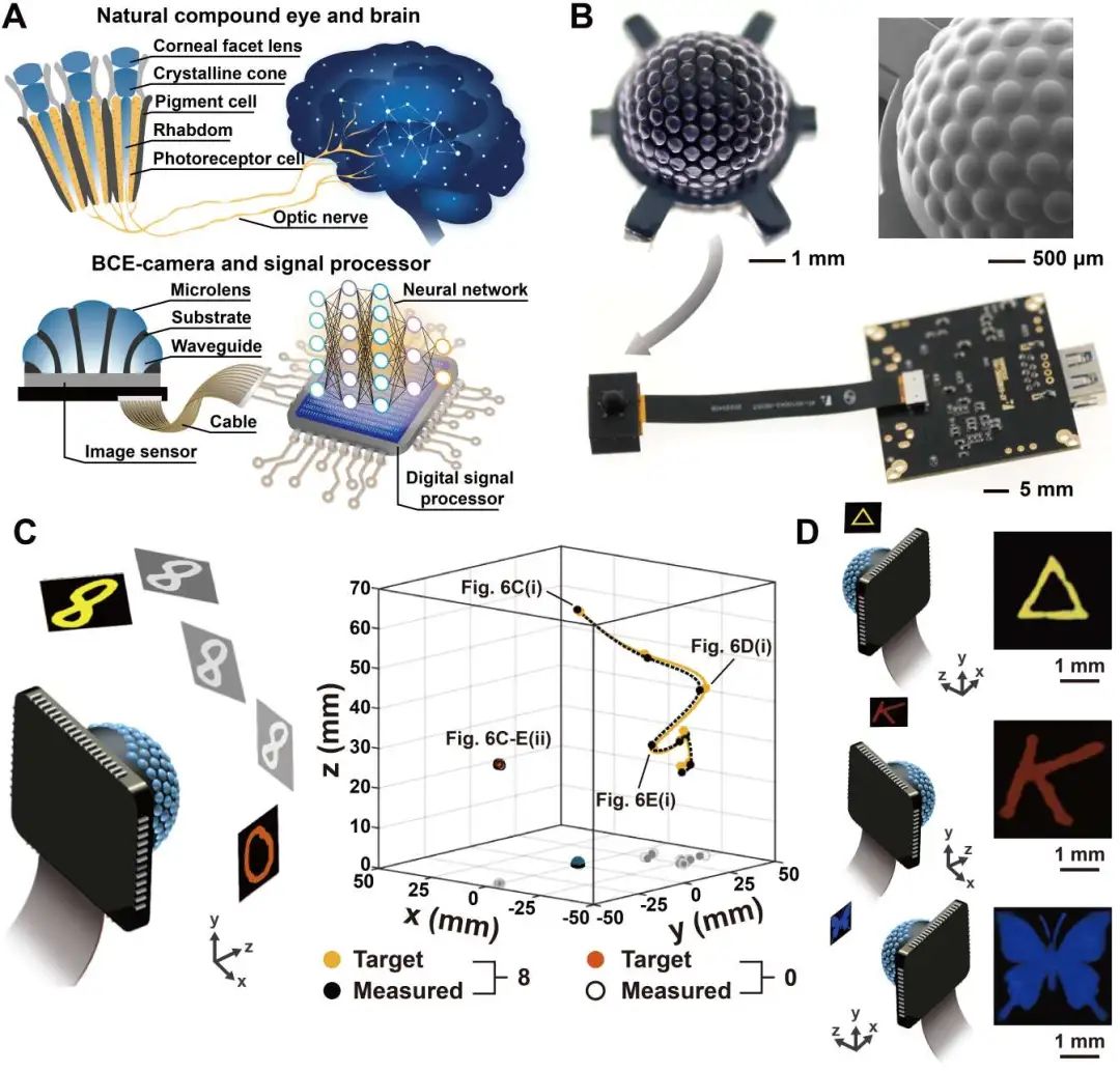 仿生视觉系统和成像效果。A 肢体动物视觉系统和仿生视觉系统;B 仿生复眼和视觉系统的实体图;C,D 使用仿生视觉系统来显示和定位目标。