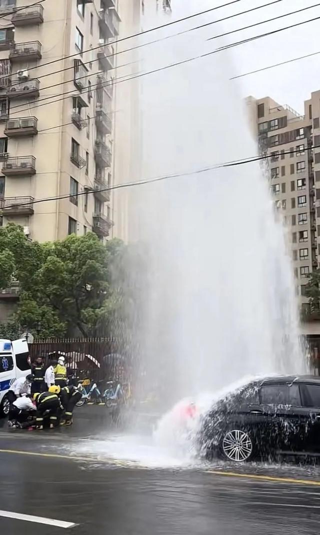 现场一片狼藉!上海的一辆车撞坏了消防栓,喷出几米高的水流。