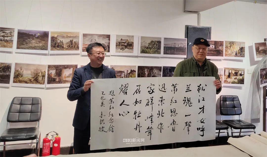 参观结束后,中国作家协会原副主席、儿童文学作家、散文家、诗人高洪波为萧红故居题词:“松江才女呼兰魂,萧红思鲁迅,东北作家群峰耸立,君如牡丹耀人心。”