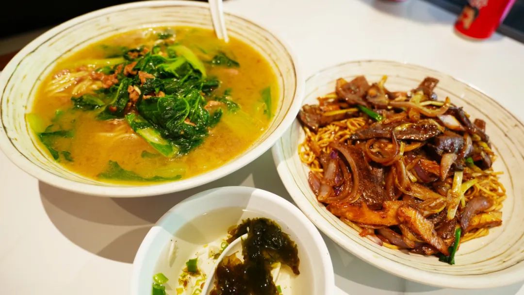 竹升反复翻滚的筋道碱水面在沸水中滚动,配上一盘菜肉,蘸上一些香醋,镇江码头的江湖气瞬间在舌尖爆发。