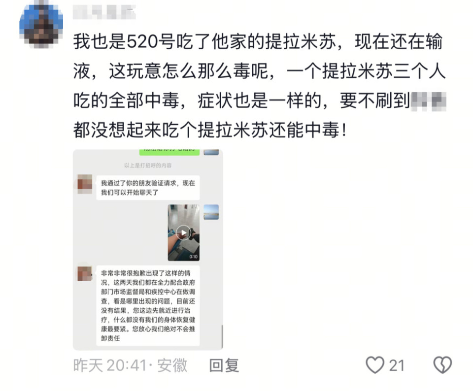 近日,安徽亳州市蒙城县多位客户在社交平台上反映,购买了当地一家在线名人流动摊贩销售的提拉米苏,食用后出现身体不适。5月24日,销售“提拉米苏”的商家和当地12315热线回应《看见》记者此事。目前,涉案商家的社交媒体账号已经设置为私人状态。