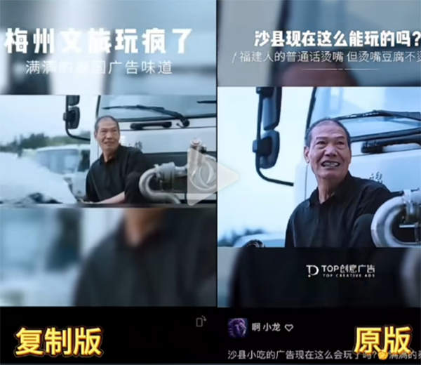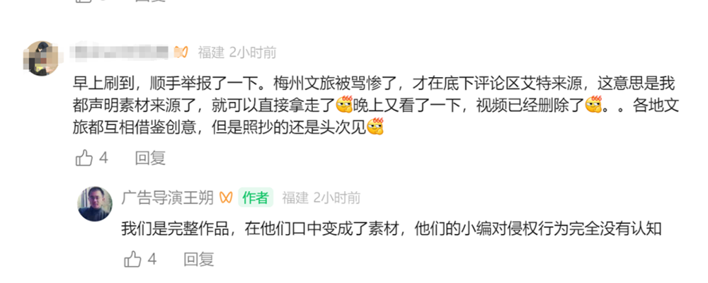 让王朔感到愤怒的是,“来梅州” “享受美味”的视频不仅几乎被复制和粘贴。 “享受幸福”的创意视频并没有提到整个视频来自福建文化旅游。直到网友在留言中谴责抄袭,梅州文化旅游官方才在视频留言中表示,视频的素材来自“清新福建” “文旅之声”。对梅州文旅官方的说法,王朔也颇有疑问:“我们这是创意作品,怎么可能是素材,这是赤裸裸的侵权。”