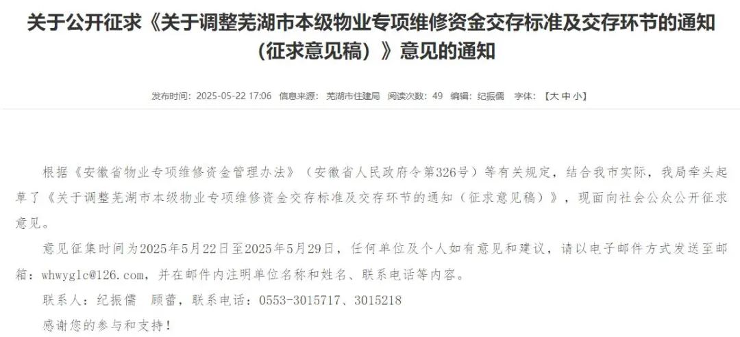 5月22日,市住房和城乡建设局发布公开征求意见通知。根据通知信息,调整了芜湖市本级物业专项维修资金的交存标准和交存阶段。