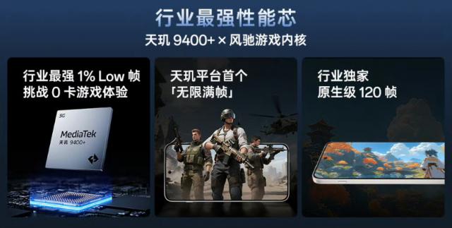 搭载天玑 9400 Cpu,并且出厂时内置「风驰游戏的核心」。