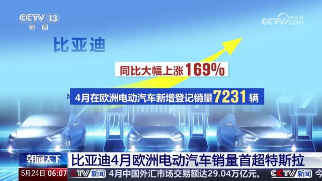 IT 世家 5 月 25 据央视新闻频道报道,日消息 CCTV13 比亚迪朝闻天下报道, 4 一个月在欧洲电动汽车新登记销售额达到 7231 辆,同比上涨 第一次超过特斯拉的169%,在当地销售十大品牌中,。以前领先的特斯拉 4 每月同期登记销售 7165 辆,跌幅 49%。
