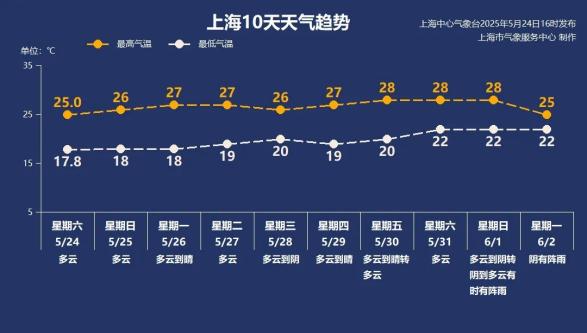 下周申城天气好,晴天或阴天天气好,周三云系多。风向以东南风为主,温度不高也不低,最高温度保持在26-28℃。暂时不用担心闷热潮湿。温和的初夏天气应该珍惜!阳光充足,出门要多注意补水防晒。下个月初,由于气流波动,当地会出现明显的风雨天气过程。