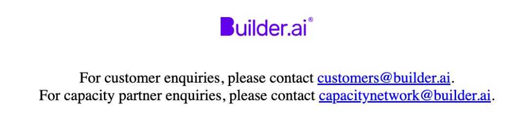 Builder.ai的官方网站已无法打开,只剩下两个联系邮箱。