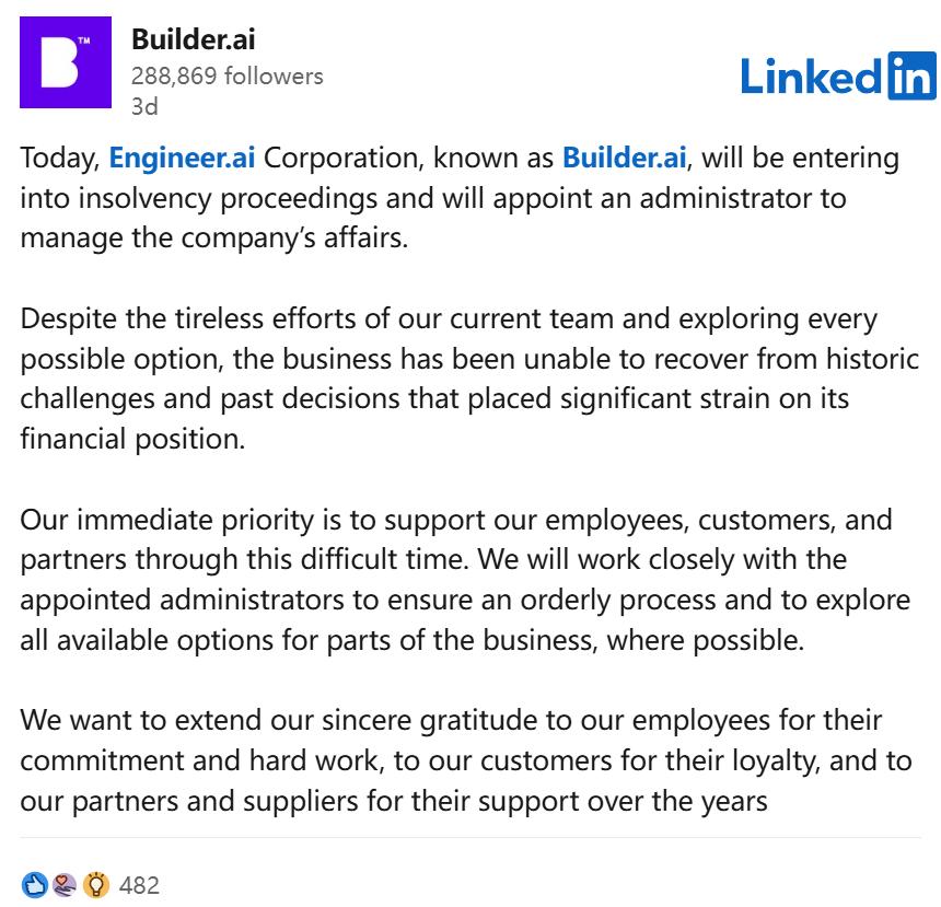 最后,Builder.ai的故事与其说是一种失败的技术,不如说是假装它曾经有效的后果。