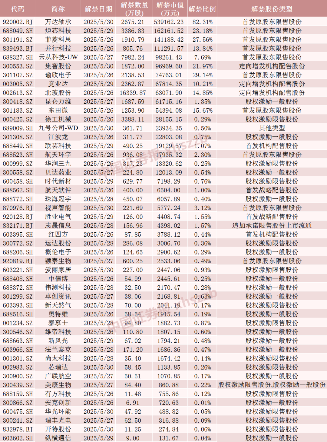 5月30日,万达轴承将解禁2675.21万股。5月29日,火炬科技将解禁3386.83万股。5月26日,菲菱科思将解禁1910.79万股。三只股票的解禁股都是首发原股东限售股。