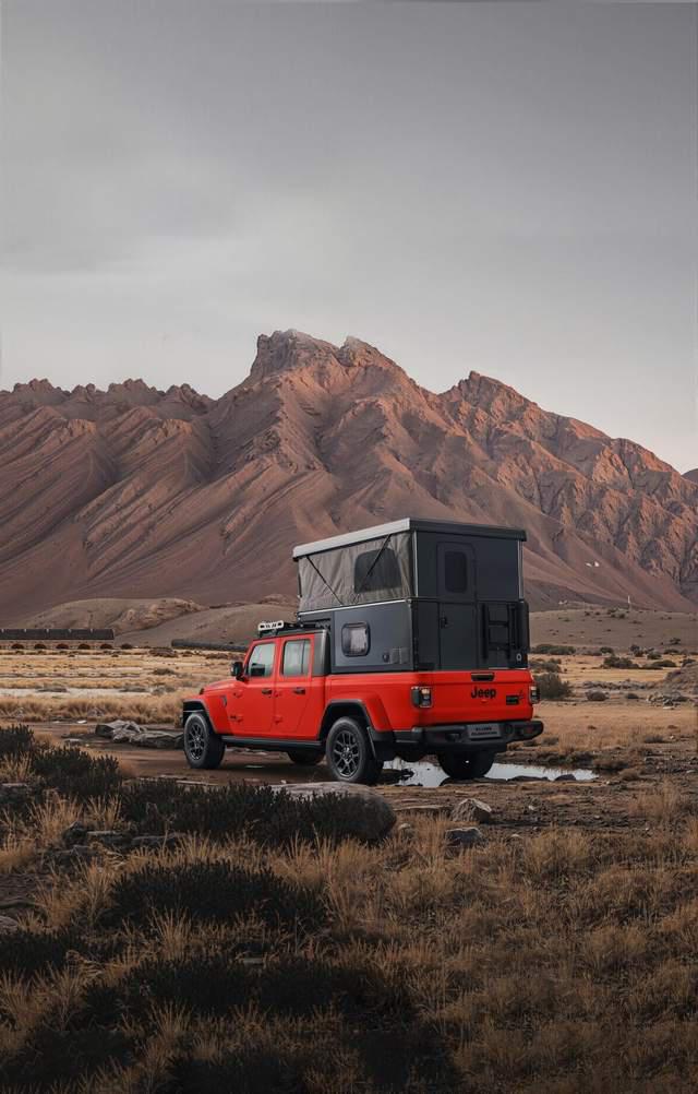 得益于搭载 Selec-Trac® 专业的智能四轮驱动,并且具有坚固的非承载式车身结构,角斗士轻松爬上红土斜坡,登顶后卸下专属 MOPAR 四轮越野沙滩车安装在大空间车顶储物平台上。门缝的戈壁砾石,曾经伴随着车主穿越丝绸之路,见证 230V 电源外放电系统在荒野中加热奶茶的烟火。插头连接时,露营灯亮起,松涛混合着电火锅的沸腾声,成为戈壁夜晚的独特之处。 BGM。