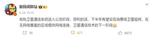 根据博主数码聊天站的消息,低轨卫星通信系统进入首测阶段,如果顺利的话,下半年有望实现消费级卫星组网。