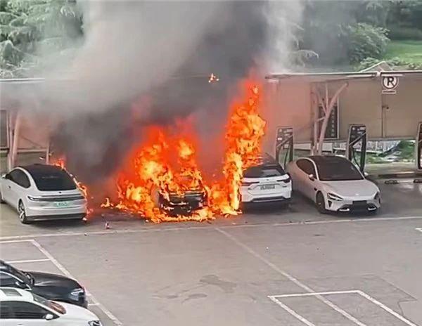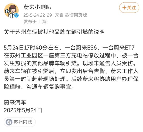 三家汽车公司中,蔚来率先作出反应。5 月 24 日夜,蔚来官方 "蔚来喇叭"" 发布说明:5 月 24 日 17 时 40 分左右,一个蔚来 ES6、一台蔚来 ET7 苏州工业区第三方充电站停车时,被一辆同类产品发生热损的车辆点燃,现场未通知人员受伤。在蔚来车辆被点燃后,立即传出后台报警,蔚来工作人员立即赶到现场进行处理。随后蔚来将协助用户办理保险理赔,沟通车辆回购事宜。