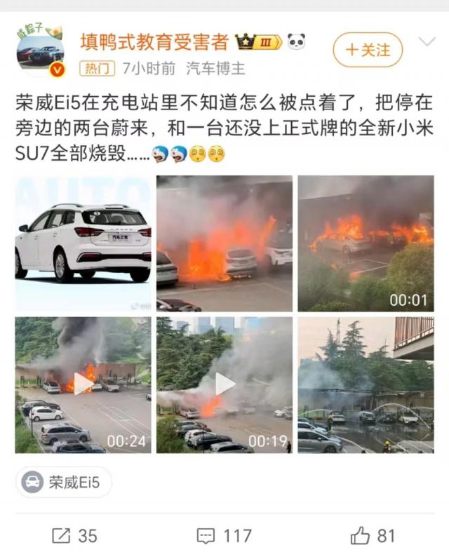 根据博主发布的图片和视频,一辆疑似荣威 Ei5 充电时突然起烟起火,停在其左右两侧的蔚来。 ES6 和蔚来 ET7 另外,一辆尚未上牌的小米被完全烧毁。 SU7 虽与荣威 Ei5 间隔一辆车,但仍被高温烘烤,导致后保险杆、尾灯组完全融化变形,损坏十分严重。