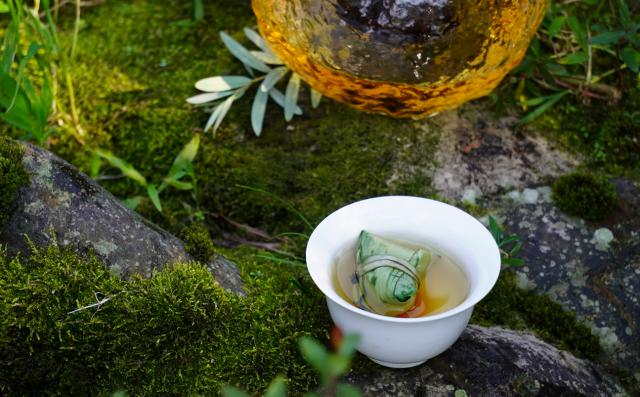 湿热的茶汤,竹叶香味溢出;等待白茶泡好,粽入茶香,香味交织,轻啜一口,如临山野,如春风!