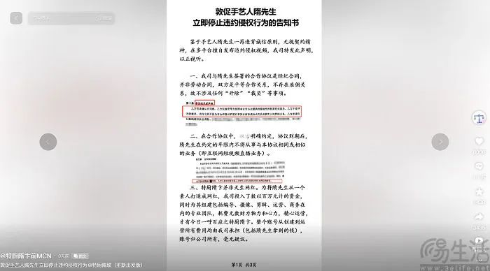 就在外界以为这件事会告一段落的时候,MCN最近在“特厨隋邈”账号背后发布了几个视频,指责隋坡违反协议,发布违约侵权视频。