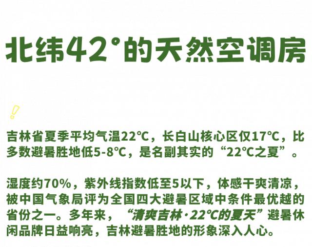 吉林位于温带大陆季风气候区。四季变化鲜明,生态环境独特。夏天,整个地区充满了温柔和清爽的气息。长白山像龙一样贯穿这里。作为欧亚大陆东缘的最高山系,它不仅划定了东北亚的气候边界,而且孕育了独特的垂直气候带。遵循每次海拔上升。 100 米气温下降 0.6 ℃自然规律,长白山犹如一道清新结界,夏日清凉宜人。