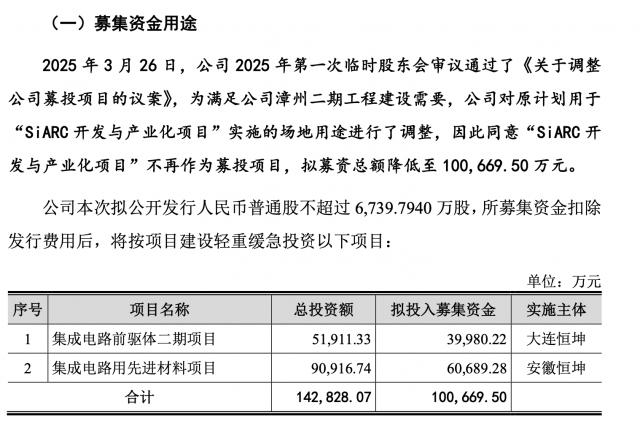 根据招股书的更新, 2024 年 12 与月公司受理时的申请内容相比,恒坤新材料的融资额度从 12 亿元减少至 10.07 亿元。与此同时,募投项目也有所减少,从“集成电路前驱体二期工程”开始,SiARC “集成电路前驱体二期工程和集成电路先进材料工程”的开发与产业化工程,降至“集成电路前驱体二期工程和集成电路先进材料工程”。