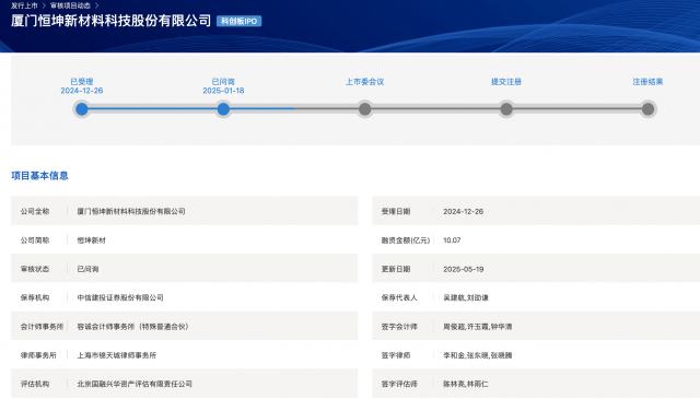 科技创新板日报5 月 26 日讯(记者 黄修眉) 这周(5 月 19 日到 5 月 25 日),1 家科创新板拟上市公司更新进展。厦门恒坤新材料科技有限公司(以下简称“恒坤新材料”)回复首轮审批咨询,更新招股书。