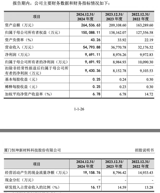 从业绩来看,2022 年到 2024 2008年,恒坤新材料实现营业收入分别是 3.22 亿元、3.68 亿元、5.48 一亿元;各自实现净利润 1.01 亿元、0.90 亿元、0.97 亿元。