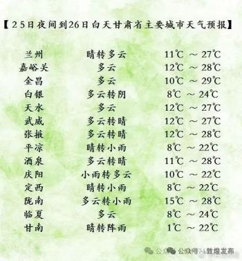 今天白天,甘南、定西、陇南、天水、平凉、庆阳等州市多云转阴,部分地区有小雨或雷暴;省内其他地方阴天或晴天。
