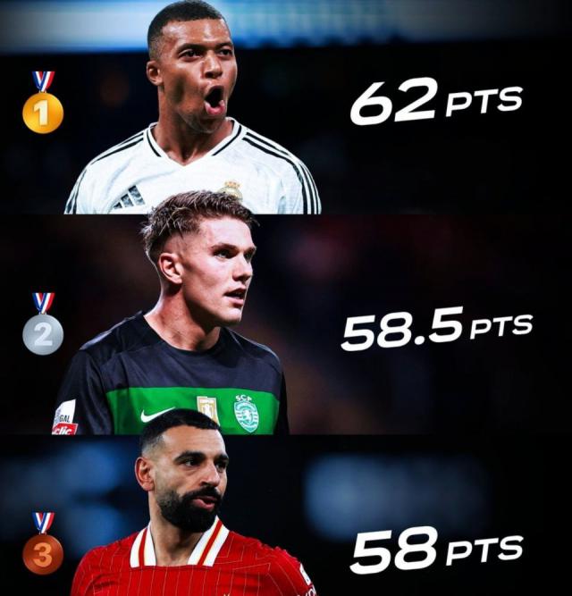 萨拉赫 58 分排在第 3 名字。巴萨前锋莱万在最后一轮进入。 2 球,但是因为之前落后太多,最后只排在第一位。 4 位置,落后于姆巴佩 4 一个球。约克雷斯、萨拉赫和莱万原本是姆巴佩对欧洲金靴奖的对手,但他们都在最后冲刺中“放慢了速度”。