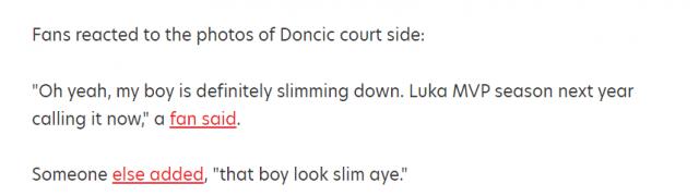 网上也出现了现场的照片,更多的粉丝认为东契奇真的很瘦。“是的,我的兄弟绝对在减肥。我猜卢卡下赛季会拿到。 MVP ”一位球迷说。另一位球迷补充道:“这小子看起来很瘦啊。”