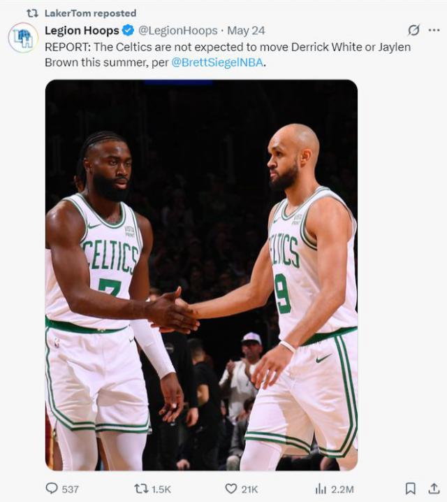 两天之前,NBA 记者 BrettSiege 据透露,波士顿凯尔特人在休赛期没有准备送走杰伦。 - 布朗和德里克 - 怀特。但是霍勒迪、波尔津吉斯、普理查德并没有说不能交易。